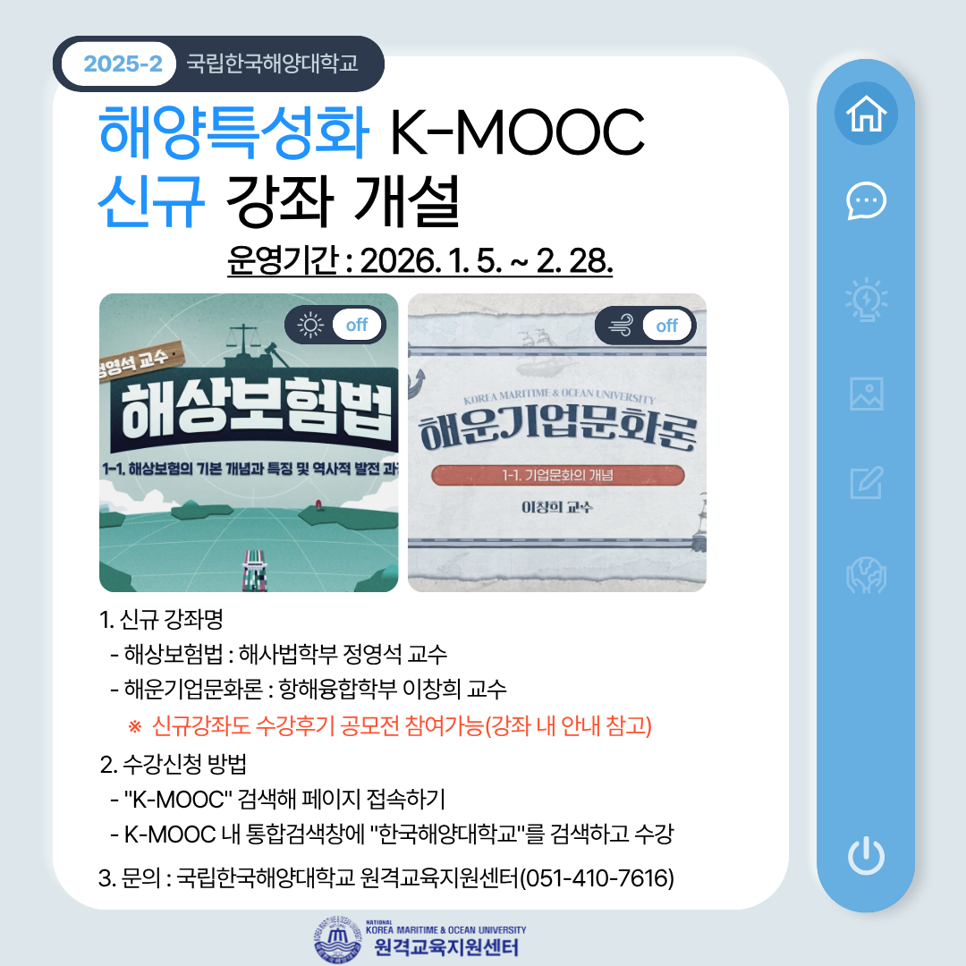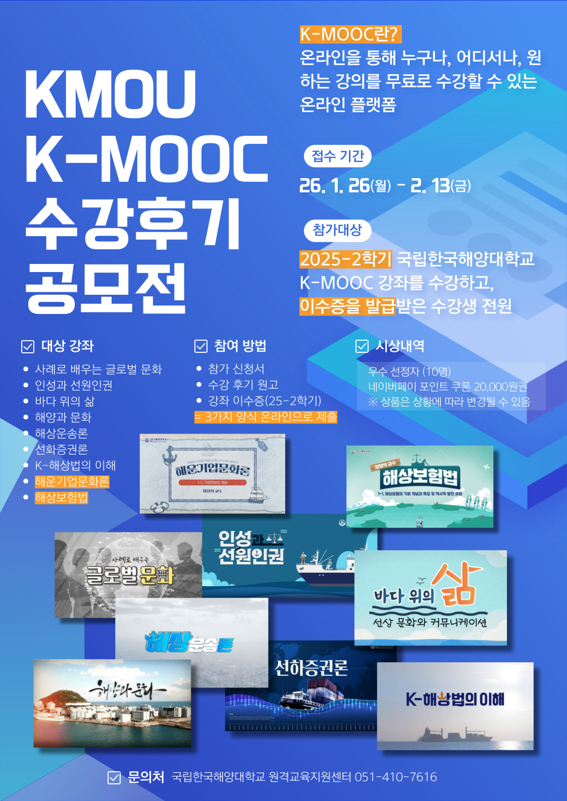 주 제 | 2025-2학기 국립한국해양대학교 해양특성화 K-MOOC 수강후기 공모전 |